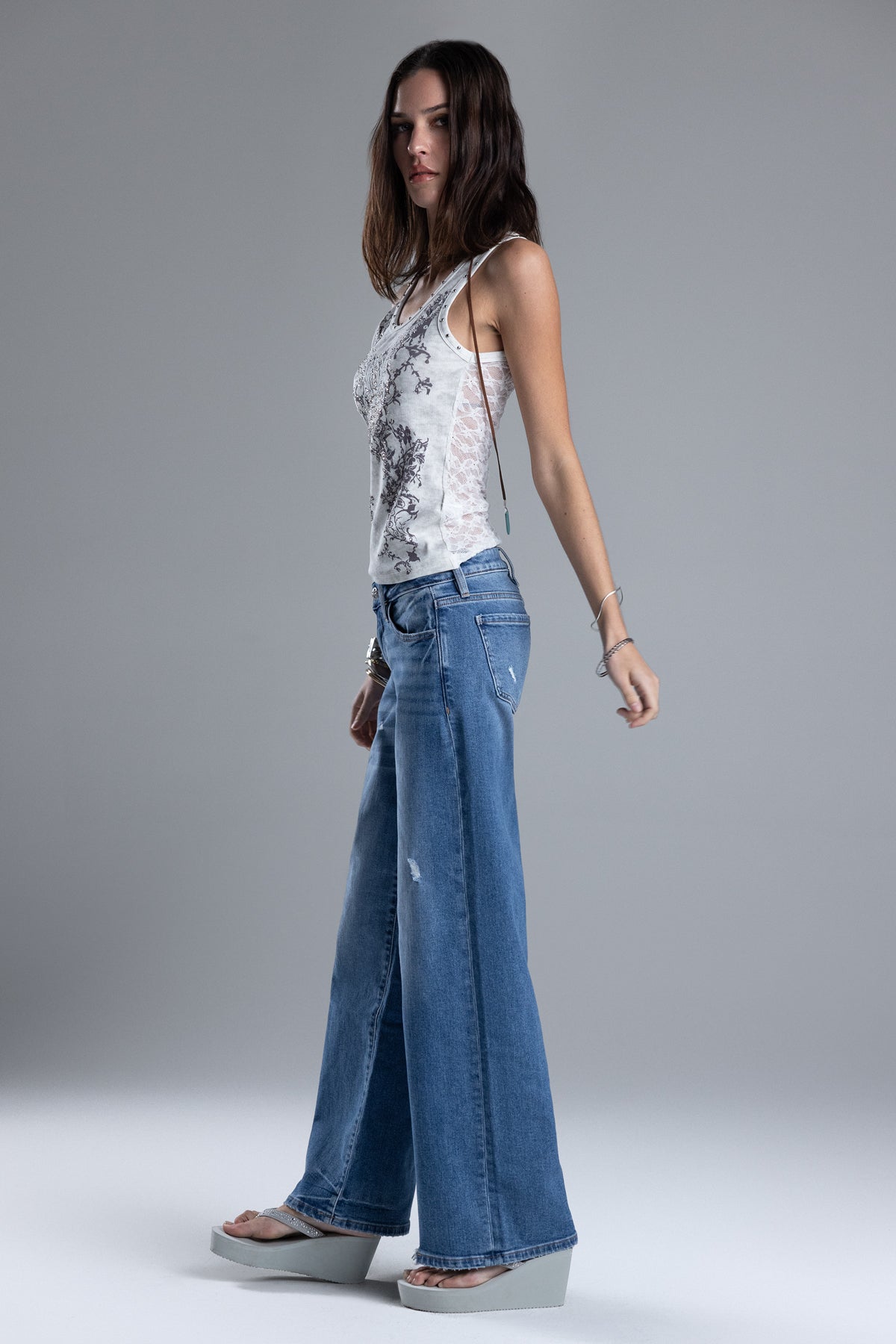 Available in Grey, Light Wash, Faded Vintage, and Light Brown Washed, mid-rise wide leg jeans – Embroidered mini gothic Miss Me logo – Ripped back pocket design – Whiskering details with intermittent distress – Faded contrast detailing – 5-pocket design Model Measurements: Height: 5????Bust: 34B Waist: 25??Hips: 36??Fabric Content: 99% Cotton, 1% Elastane Care: Gentle machine wash inside-out with like colors in cold water. Tumble dry low. Style No. Medium Wash: M2350WS-M1012, M2350WV-M1012