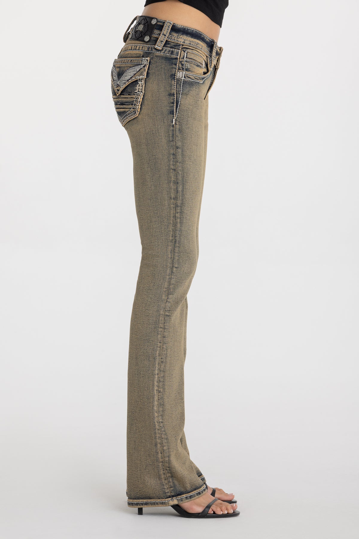 Low-rise bootcut jeans – Embroidered wing faux flap design – Denim scrunching details – Studded rhinestone rivet accents – Embossed black studded leather cross Miss Me brand patch – Functional back pockets – 5-pocket design Model is wearing size: 25 Model Measurements: Height: 5’8″ Bust: 32B Waist: 25″ Hips: 35″ Fabric Content: 99% Cotton, 1% Elas (Spandex) Care: Gentle machine wash inside-out with like colors in cold water. Tumble dry low. Style No. L9543BL-V143, L9543BS-V143, L9543BV-V143